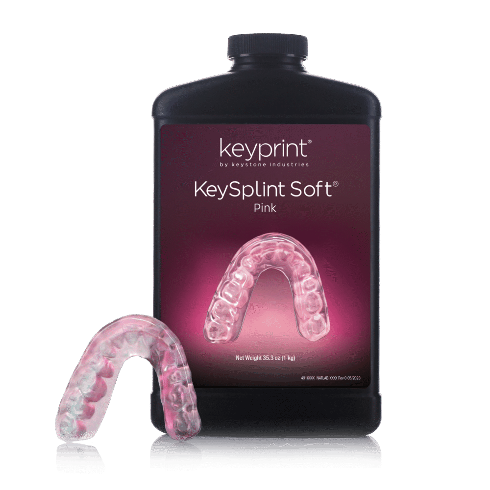 Utilizing unique patent-pending technologies, Keystone Industries has developed a one-of-a-kind 3D printing resin for the fabrication of flexible dental splints, nightguards, and bleaching trays. This DLP-optimized resin is an exceptional printing material, that combines the strength needed to protect teeth against disorders like bruxism with added flexibility for better patient comfort. KeySplint Soft is also easily cleaned by the patient.